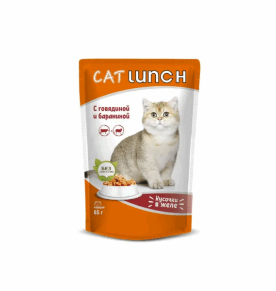 КЭТ ланч Корм консервированный полнорационный для кошек, кусочки в желе с говядиной и бараниной 85 г, 24 пауча. Без ГМО, без консервантов, без ароматизаторов и усилителей вкуса, без искусственных красителей, без вредных добавок.