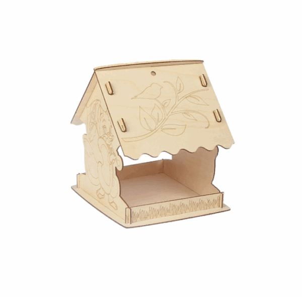 Чтобы собрать кормушку, аккуратно соедините фанерные детали, вставляя их в пазы. Используйте клей для лучшей фиксации. При желании модель можно раскрасить или задекорировать.
