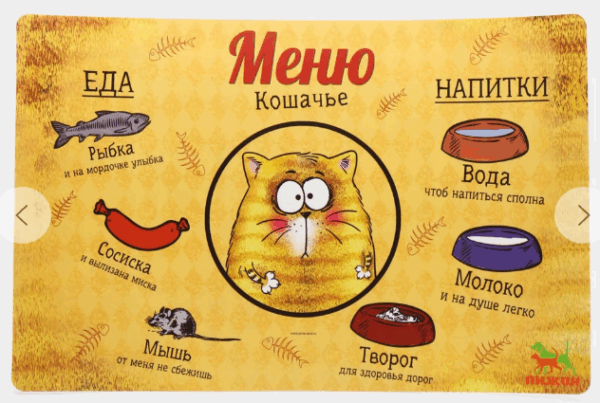 Коврик под миску «Меню кошачье» с нескользящим основанием имеет размер 43×28 см. При помощи этого коврика вы с легкостью будете поддерживать чистоту и порядок на месте кормления вашего домашнего питомца.