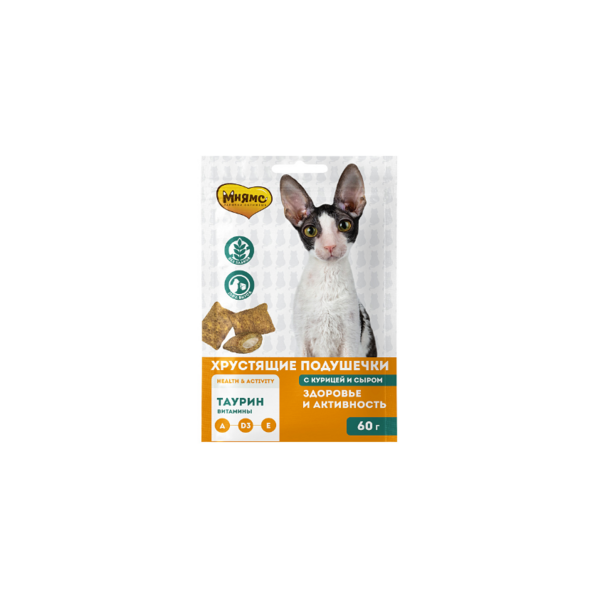 Хрустящие подушечки с начинкой из курицы и сыра от «Мнямс» – это изысканное и полезное угощение, от которого не откажется даже самая привередливая и избалованная кошка. Входящий в состав таурин, витамины A, D3, E положительно влияют на зрение, сердечнососудистую систему, репродуктивную функцию.