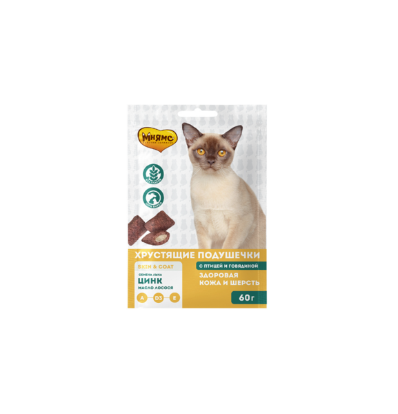 Хрустящие подушечки с начинкой из птицы и говядины от «Мнямс» – это изысканное и полезное угощение, от которого не откажется даже самая привередливая и избалованная кошка. Входящий в состав конопляное масло, ростки пшеницы, семена льна, цинк и витамины A, D3, E благотворно воздействуют на кожу и шерсть: предотвращают выпадение шерсти, кожные проблемы, придают блеск шерсти.