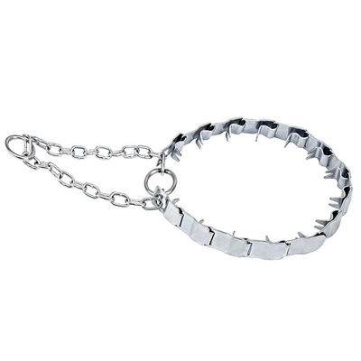 Ошейник из металлических пластин с загнутыми со стороны шеи собаки шипами. Крайние звенья крепятся к стропам и закрепляются на фастекс. Детали ошейника оцинкованные.