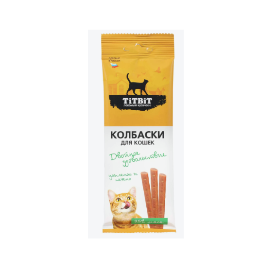 Колбаски для кошек Двойное удовольствие – это колбаски, которые благодаря сочетанию двойного вкуса нравятся кошкам вдвойне. Такие вкусняшки для кошек от Титбит станут прекрасным угощением. В упаковке 8-9 колбасок по весу.