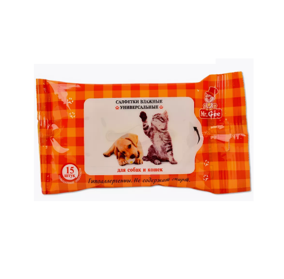 Салфетки влажные Mr.Gee класса Premium, мягко и бережно очищают и увлажняют кожу питомца, придают блеск шерсти, так же нейтрализуют неприятные запахи. Не раздражают слизистую оболочку питомца. Устраняют неприятный запах. Гипоаллергенны.